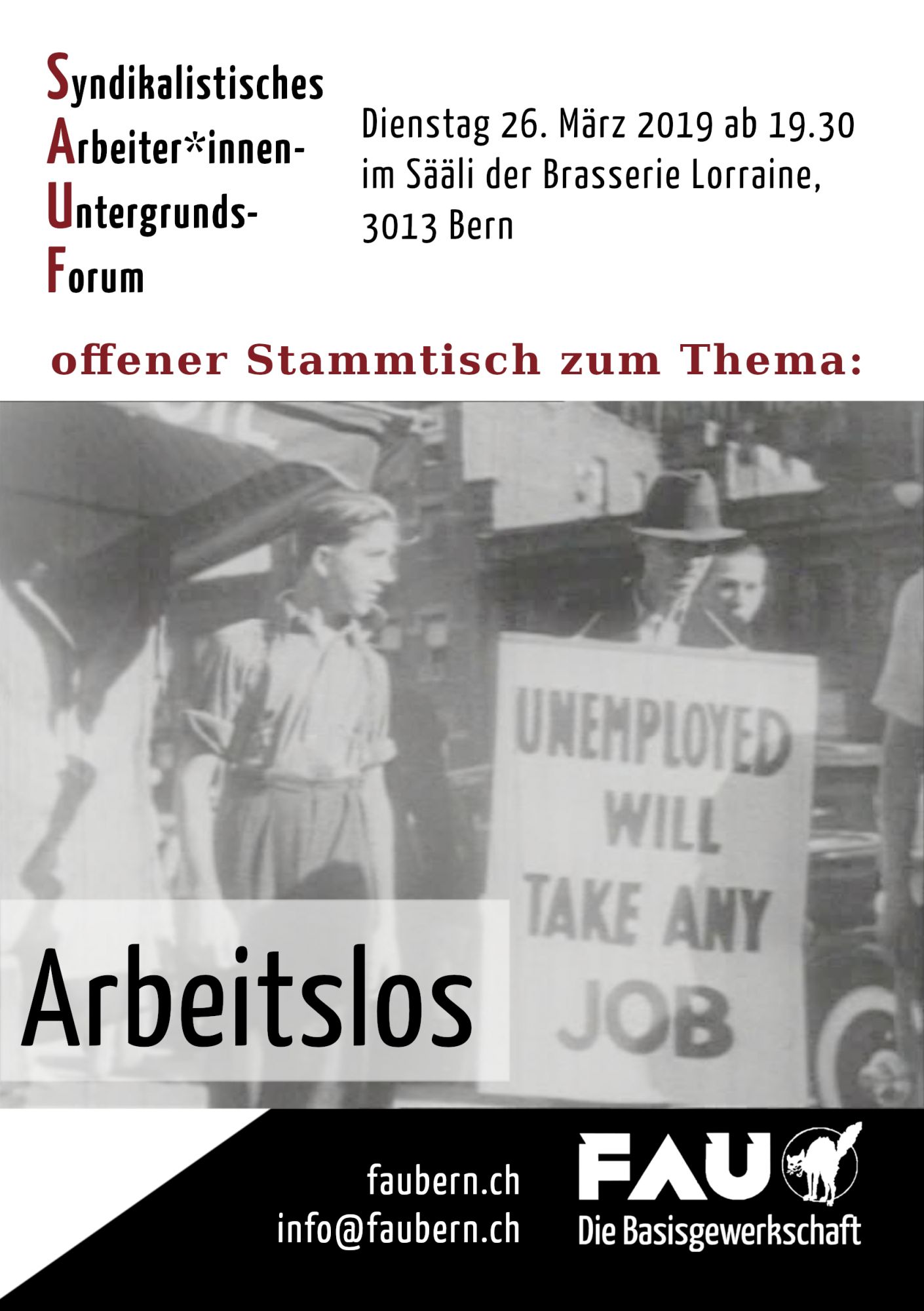 Jeden vierten Dienstag im Monat lädt die Basisgewerkschaft FAU Bern zu einem ungezwungenen Austausch, dem SAUF (Syndikalistisches Arbeiter*innen-Untergrunds-Forum) ein. Es soll eine Diskussionsplattform sein, welche ein Lernen von unten ermöglichen soll. Bei Bier, Eistee oder sonst was soll sich jeden Monat einem Thema gewidmet werden. Das SAUF ist keine Vortragsreihe, sondern ein ungezwungener Austausch untereinander. Komm doch mal vorbei, wir freuen uns.