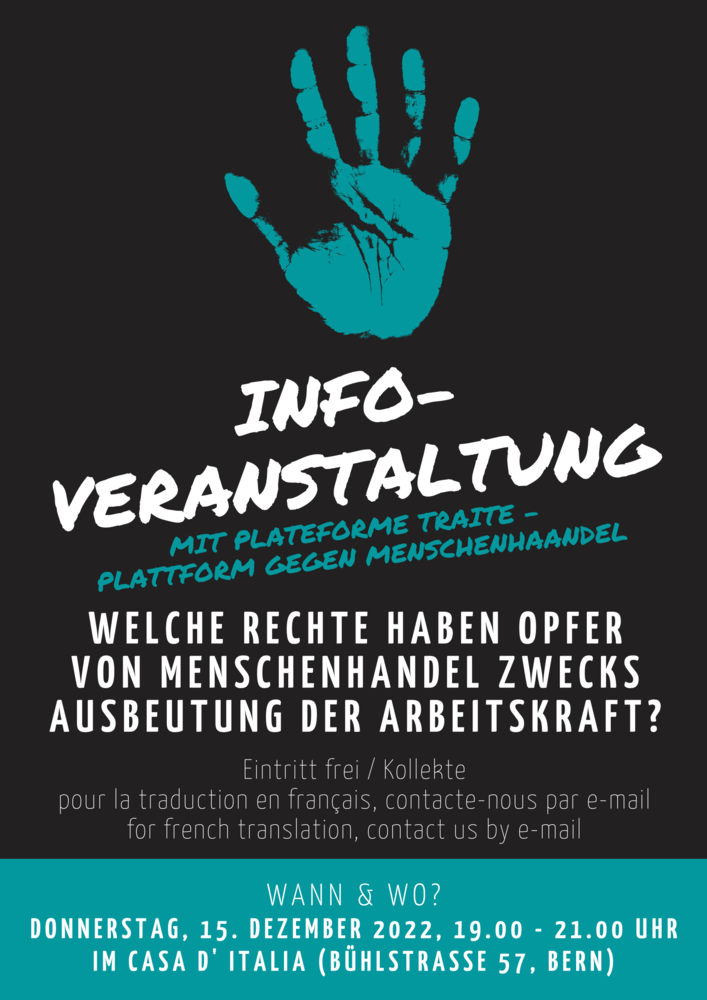 Dies passiert, obwohl einige dieser Menschen eigentlich Opfer von Menschenhandel zwecks Ausbeutung der Arbeitskraft wurden und sie deswegen nicht aufgrund von "illegalem" Aufenthalt bestraft werden dürfen. Zudem haben sie Anspruch auf Leistungen der Opferhilfe, wie z.B. Finanzierung eines Rechtsbeistandes sowie Zugang zu einer Schutzunterkunft und medizinischer Versorgung. Ausserdem haben sie das Recht auf eine Aufenthaltsbewilligung, falls ein Strafverfahren gegen die Ausbeuter:innen eröffnet wird oder sie besonderen persönlichen Schutz brauchen.